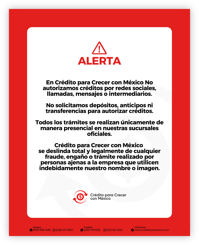 El Buró de Entidades Financieras contiene información de Crédito para Crecer con México, S.A. DE C.V. SOFOM E.N.R. sobre nuestro desempeño frente a los Usuarios, por la presentación de productos y servicios. Te invitamos a consultarlo a través de http://www.buro.gob.mx/ o también en la página de Crédito para Crecer con México.